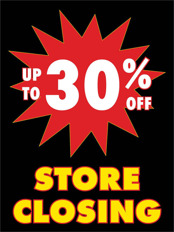 Up To 30% Off Store Closing | Retail Window Display Sign | 18"W x 24"H