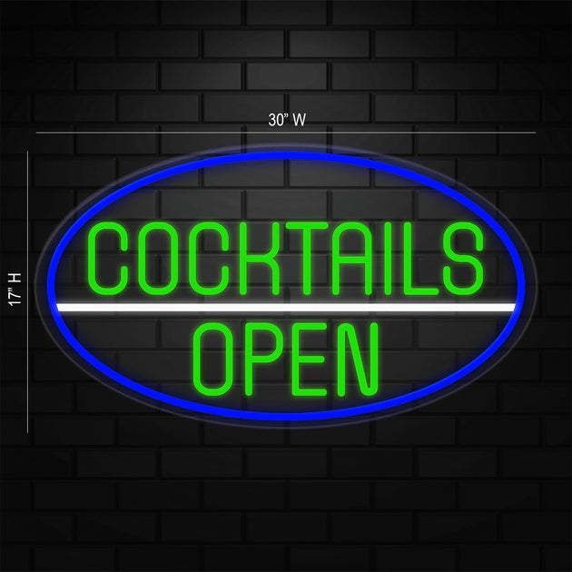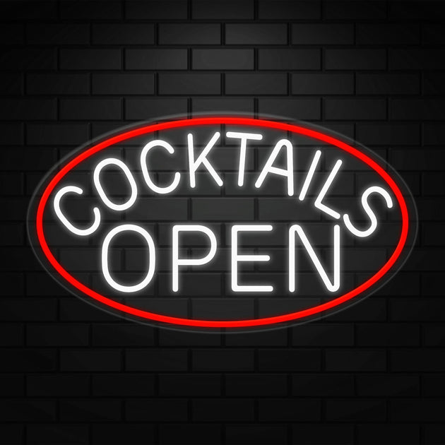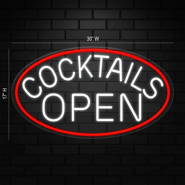 Cocktails Open Neon Sign for Retail Displays | LED Flex Neon | 30"W x 17"H x 1"D