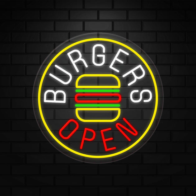 Burgers Open Sign for Business Displays | LED Flex Neon | 26"W x 26"H x 1"D