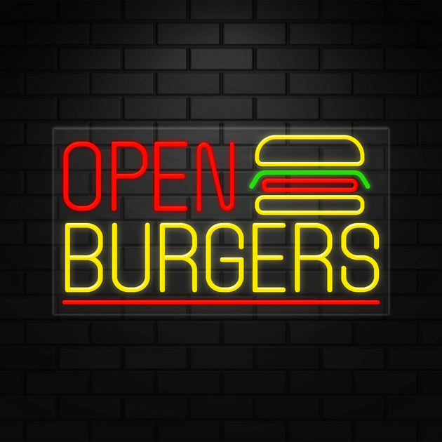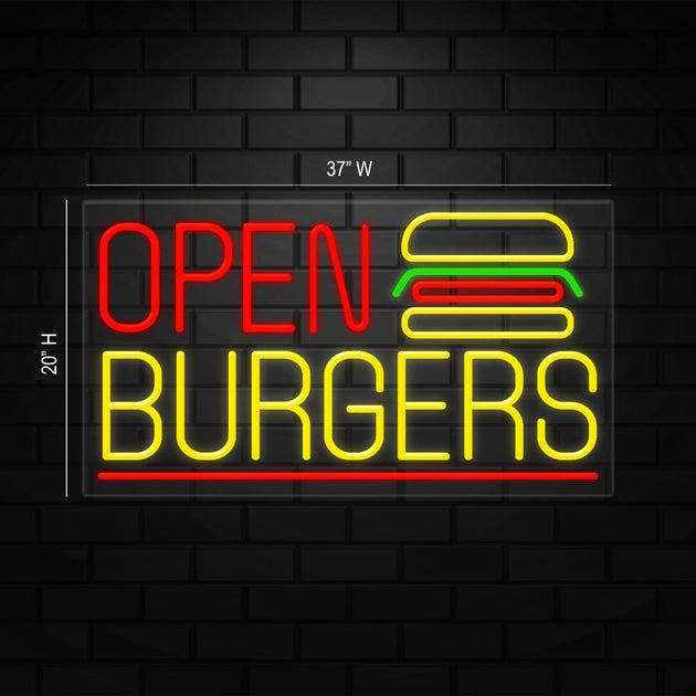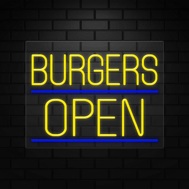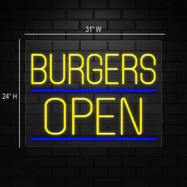 Burgers Open Neon Sign for Retail Displays | LED Flex Neon | 31"W x 24"H x 1"D