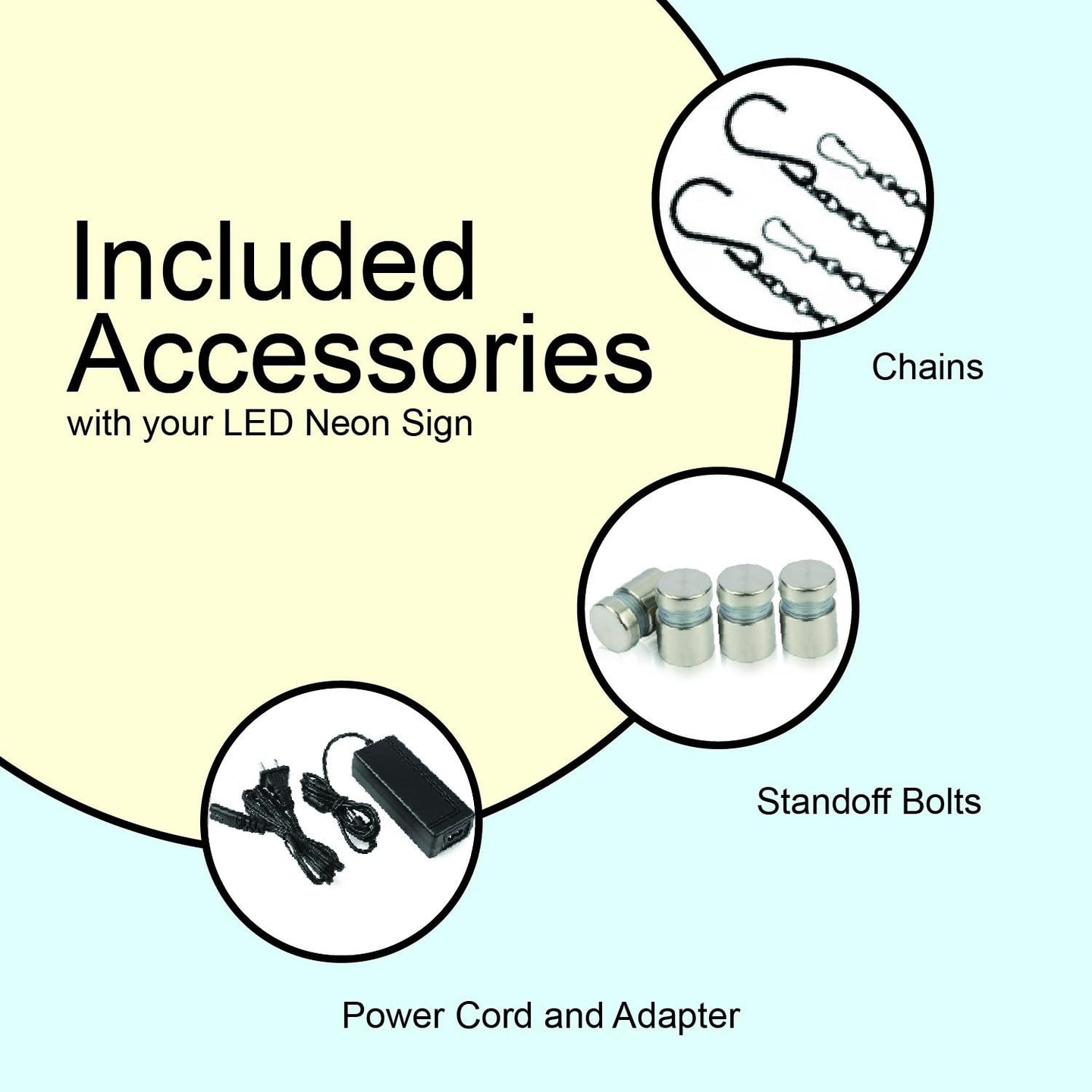 - Sign is mounted on acrylic clear backing and comes with power adapter, remote controller with on/off switch & dimmer, stand offs and hanging kits