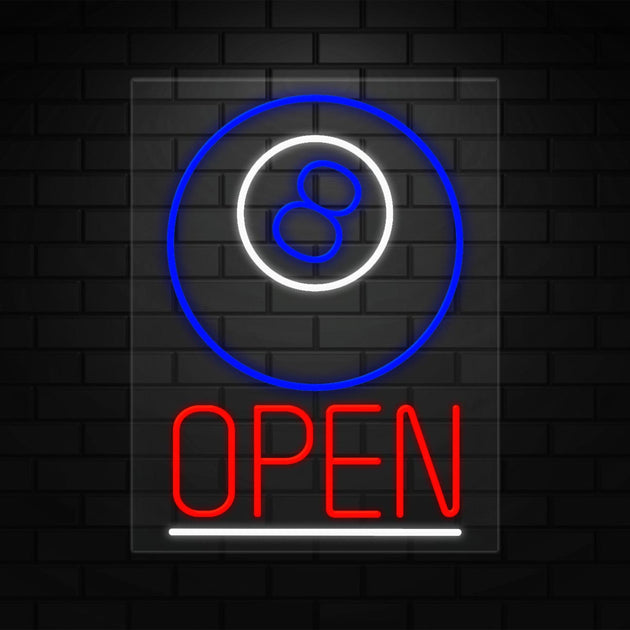 Open with Billiards Sign for Business | LED Flex Neon | 31"W x 24"H x 1"D