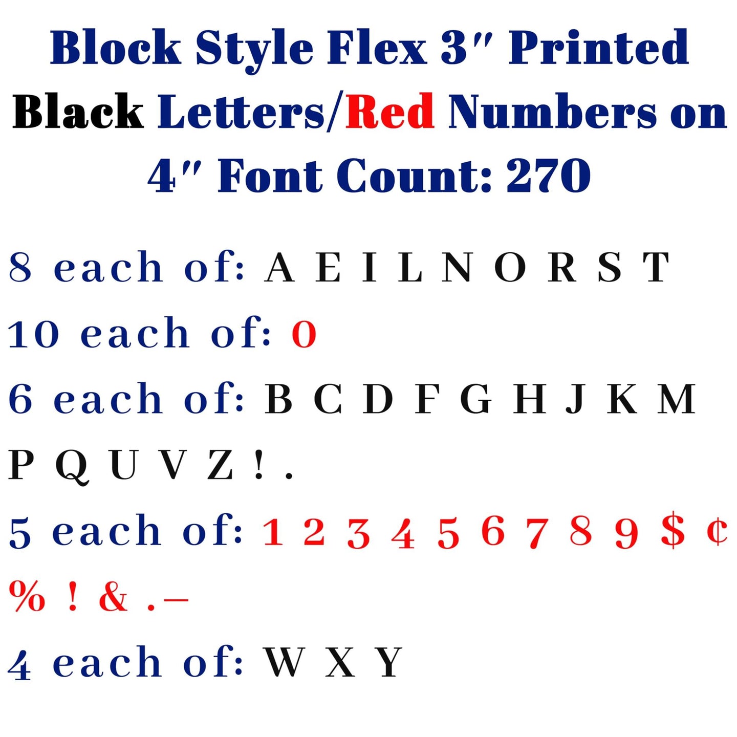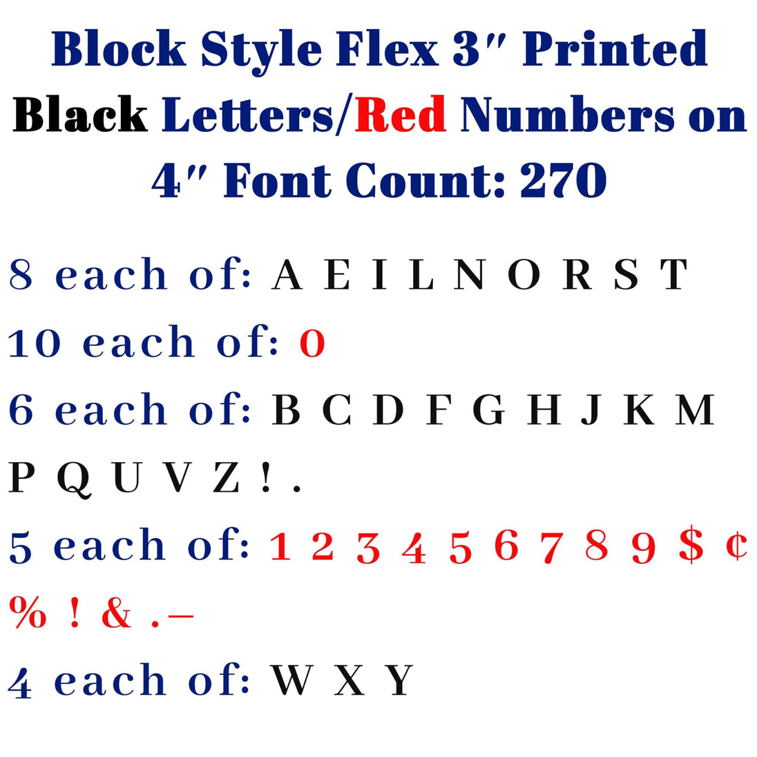 Block Style Flex change letters are the second most popular of all flexible plastic letters on the market. 8? Printed Black Letters/Red Numbers on 8-7/8? Clear Background plastic Font Count: 300. These letters should not be used on signs if the letters are encased within a wind or vandalism cover. Portable sign letters are thin and bendable from one end to the other. These will NOT replace the thicker "RIGID" marquee letters. These are not replacements for Rigid, Gemini, or Zip letters. The track used by rigid type flat letters is called "Push up drop-down track."