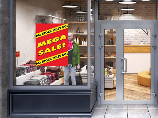 All Stock Must Go ! Mega Sale | Retail Window Display Sign | 18"W x 24"H