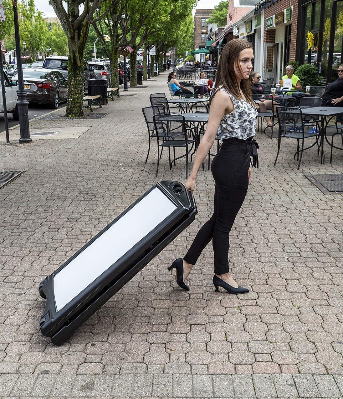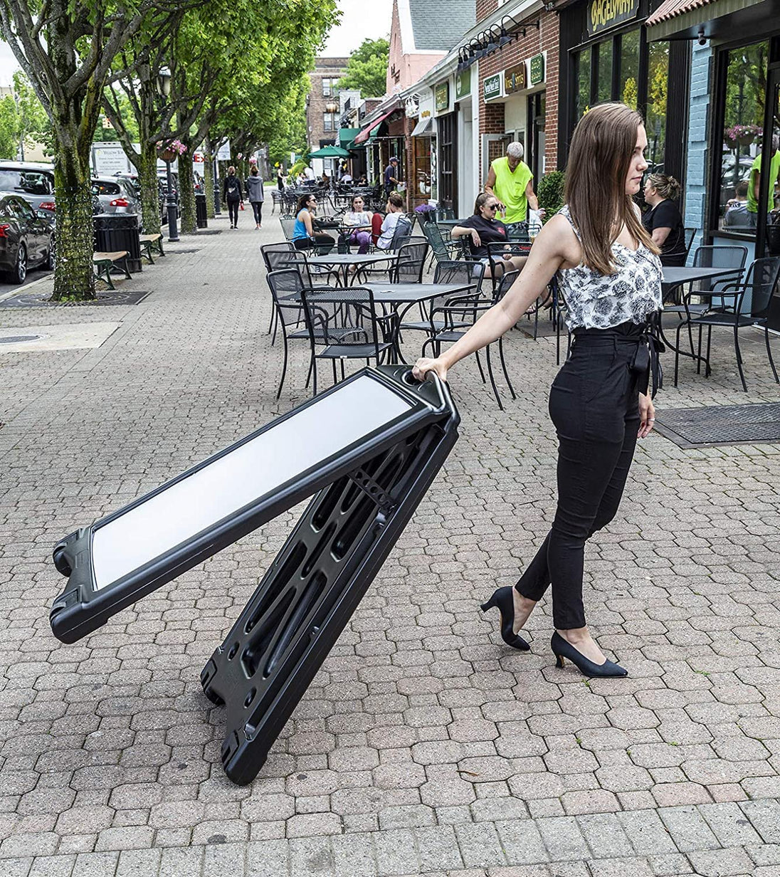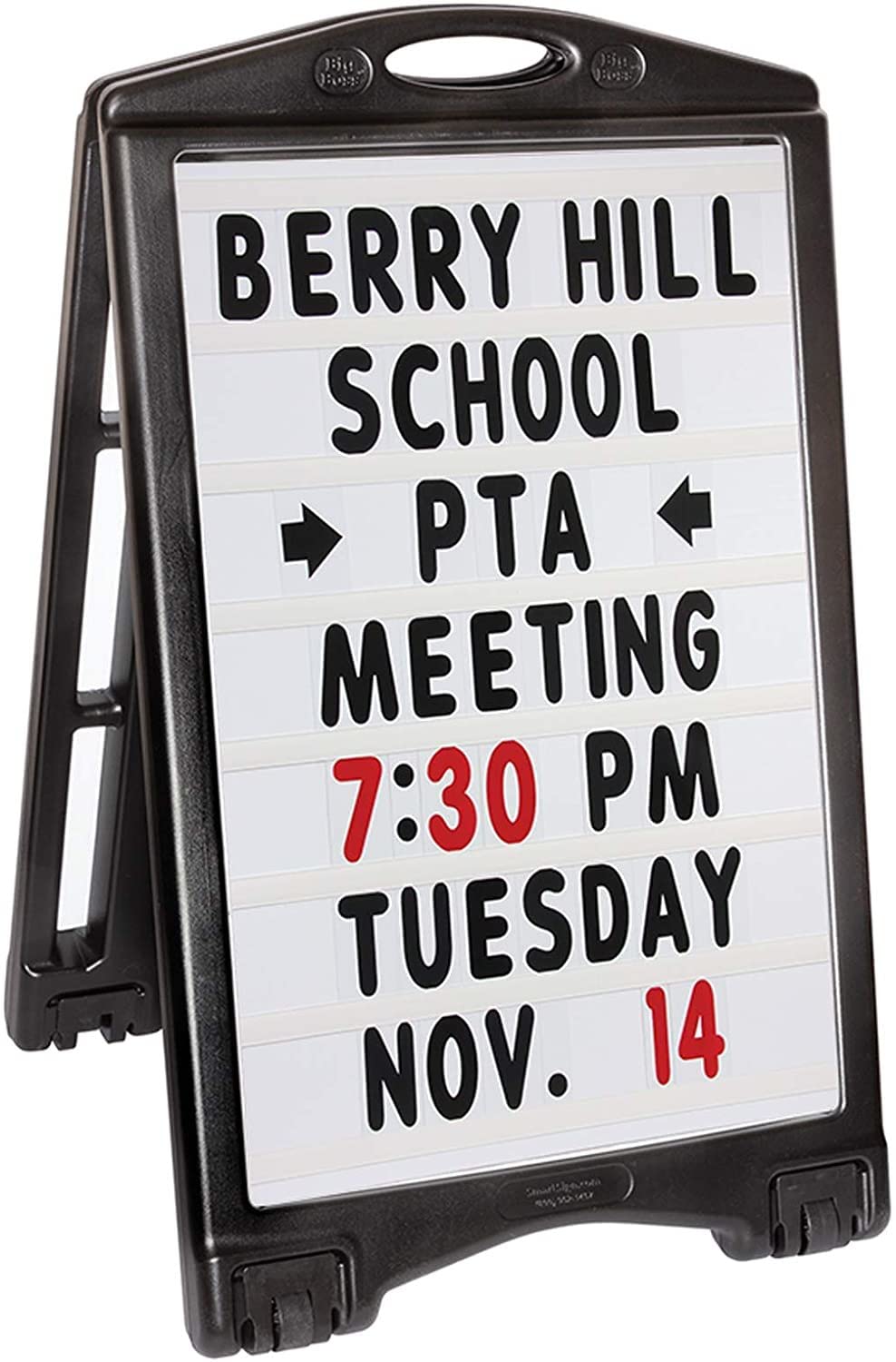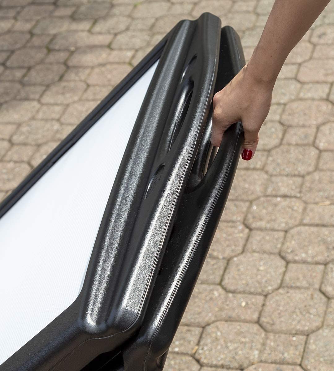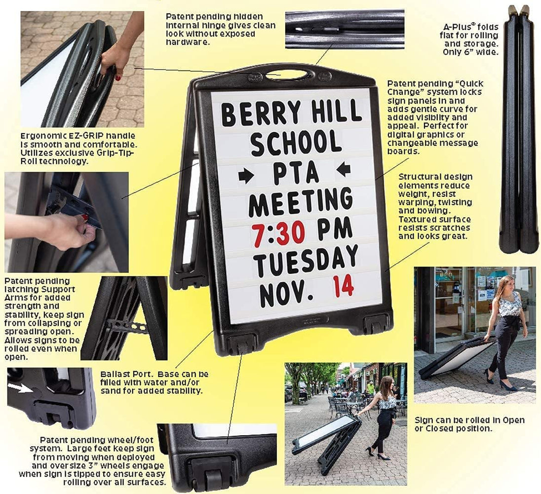 Jump out and grab people’s attention with this highly visible a-frame sandwich sign! This portable sidewalk sign will be the perfect advertising addition to any business. Weather resistant and durable, the A-Plus Standard Message Board Sign will last outdoors for years with no setup or maintenance required. Increase walk-in sales by making a positive curbside impression on anyone who walks or drives by. Exclusive ‘GRIP-TIP-ROLL’ systems make this the easiest sign to use, can be rolled whether it’s open or closed which means no more heavy lifting to move your sign. Letter & Number Kit included with your purchase. Made in the USA!